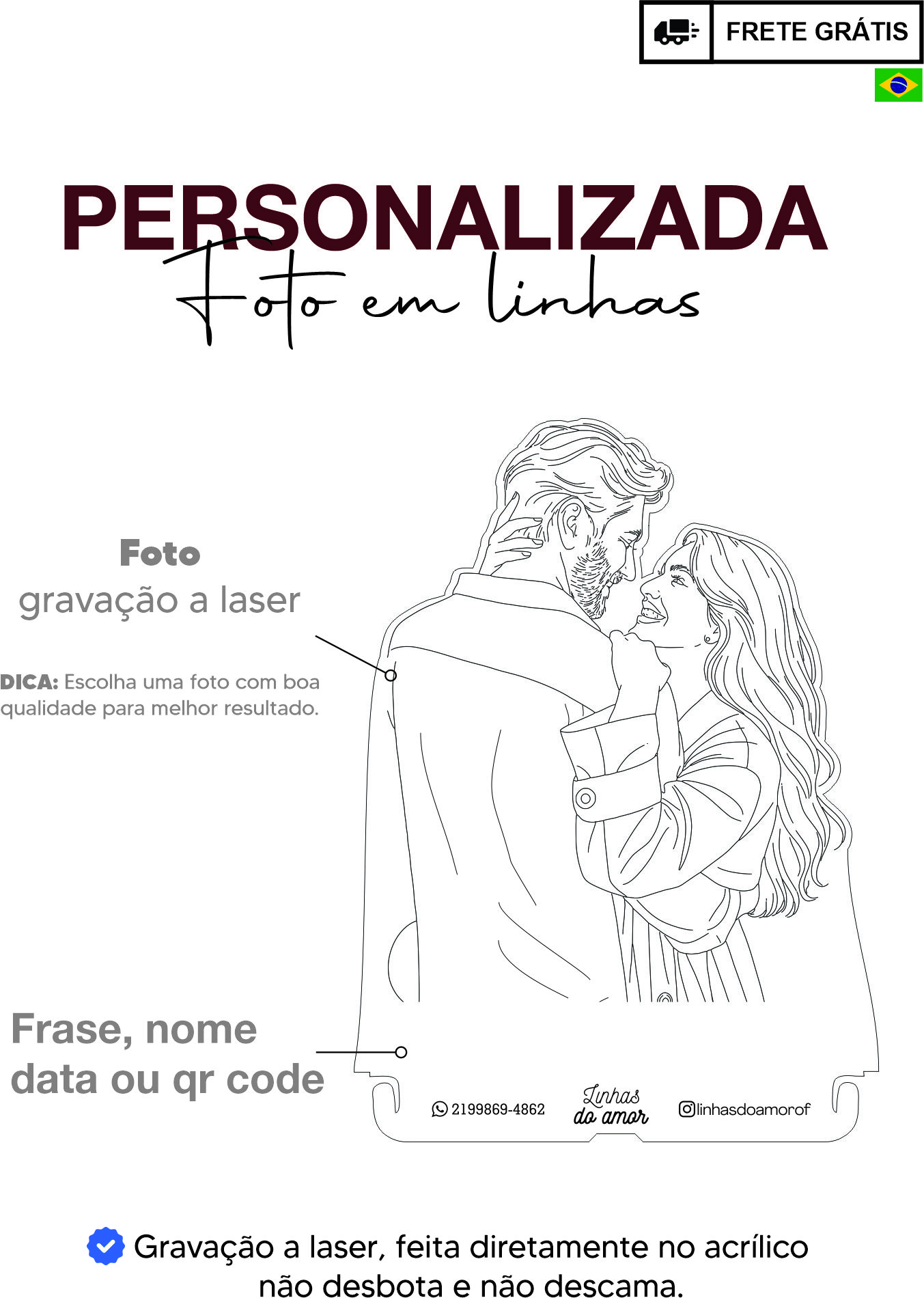 Cada detalhe é cuidadosamente gravado em acrílico iluminado, apoiado em uma base de madeira elegante, criando um desenho artístico que transmite sentimento e beleza.